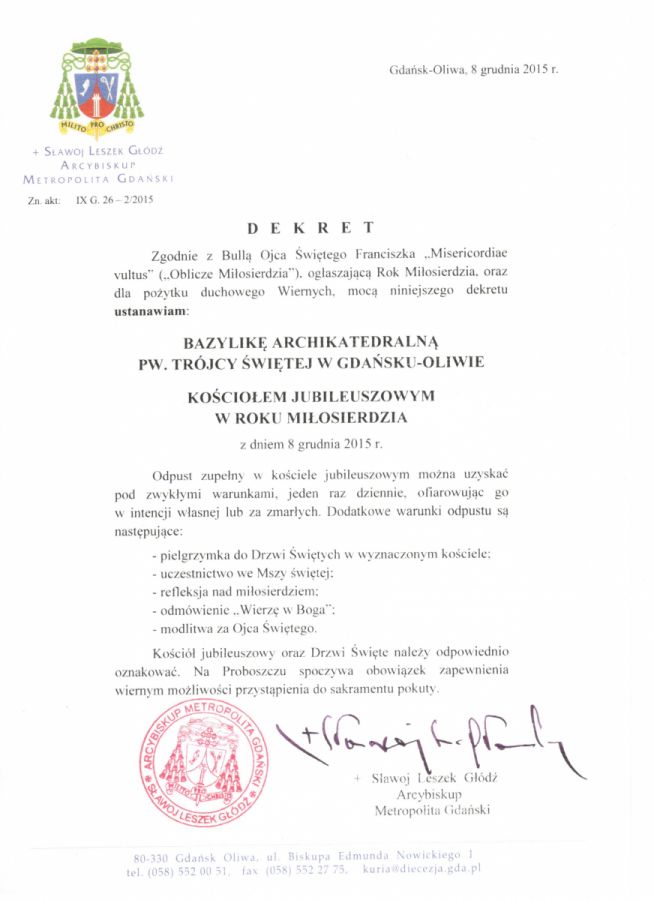 Ksiądz Arcybiskup Metropolita Gdański specjalnym dekretem ustanowił Bazylikę Archikatedralną jednym z Kościołów Jubileuszowych w archidiecezji gdańskiej na czas Roku Miłsierdzia. Związana jest z tym łaska odpustu.